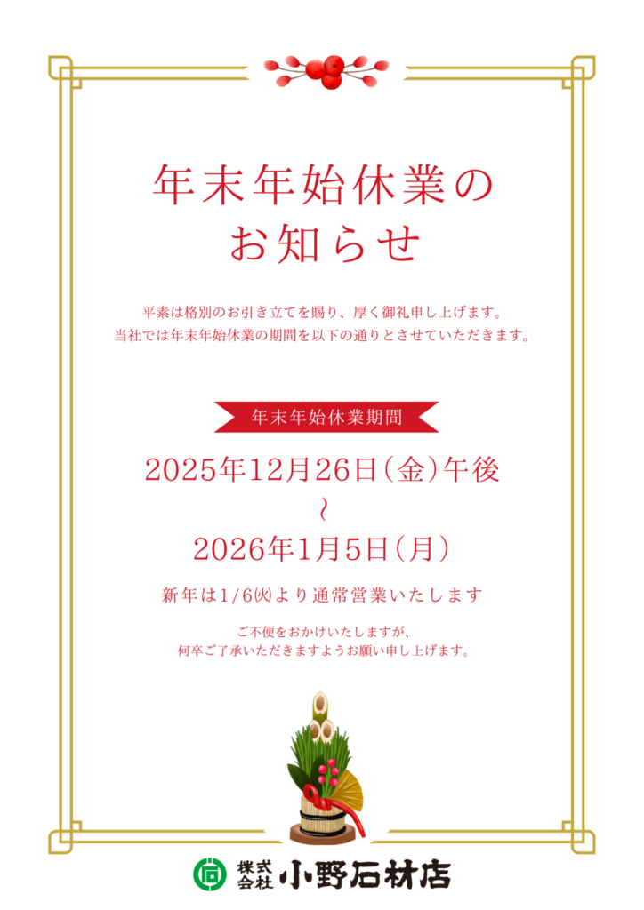 新年は2026年1月6日(火)8時より、平常通り営業させて頂きます。